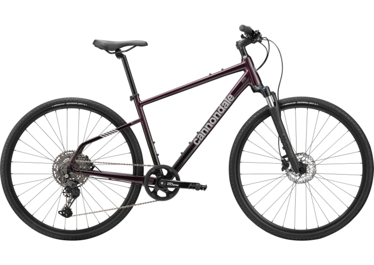 The Cannondale Quick CX 2 offers comfort, control, visibility, and speed. The bump-absorbing suspension fork, multi-surface tires and reflective graphics keep you visible on the highways and byways at all times. The SmartForm C3 Alloy frame is super lightweight, and the front fork has a remote lockout for flat roads. The double wall rims and 700 x 40c Vittoria tires are as adventure hardy as your imagination. The Shimano 2x10 drivetrain offers smooth shifting and hydraulic disc brakes give you powerful and precise braking when you need it. Available in Royal Purple and Storm Cloud.