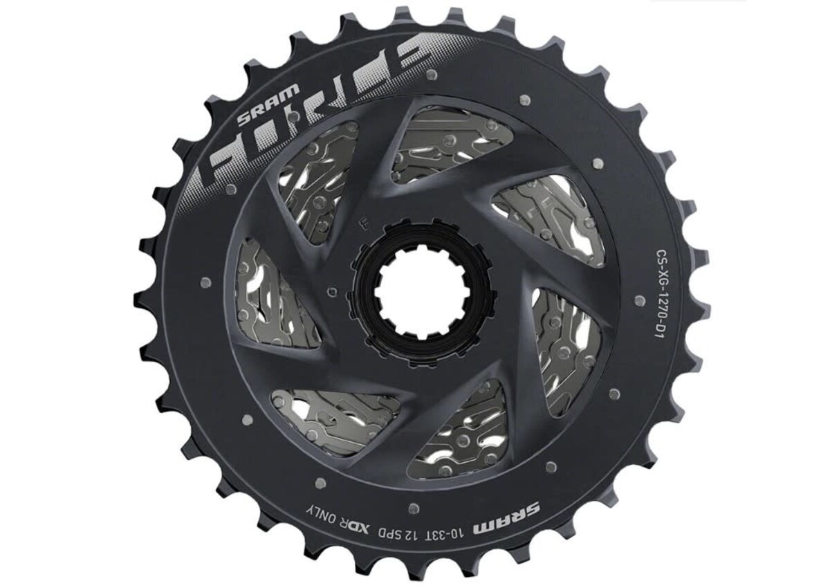The SRAM Force AXS XG-1270 Cassette is optimized for electronic shifting. It features X-Range gearing technology and a 10-tooth small cog to progress fluidly and efficiently. The XG-1270 cassette is designed to operate with XDR driver bodies.