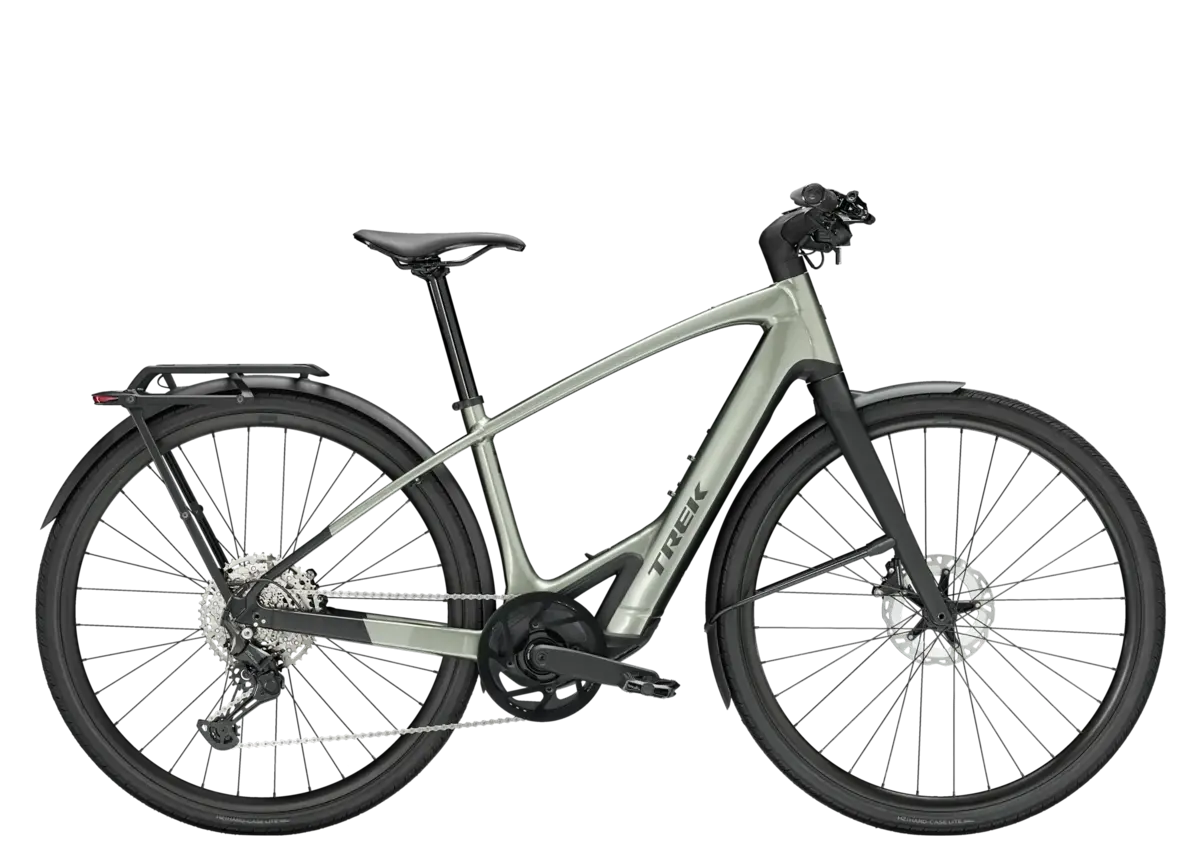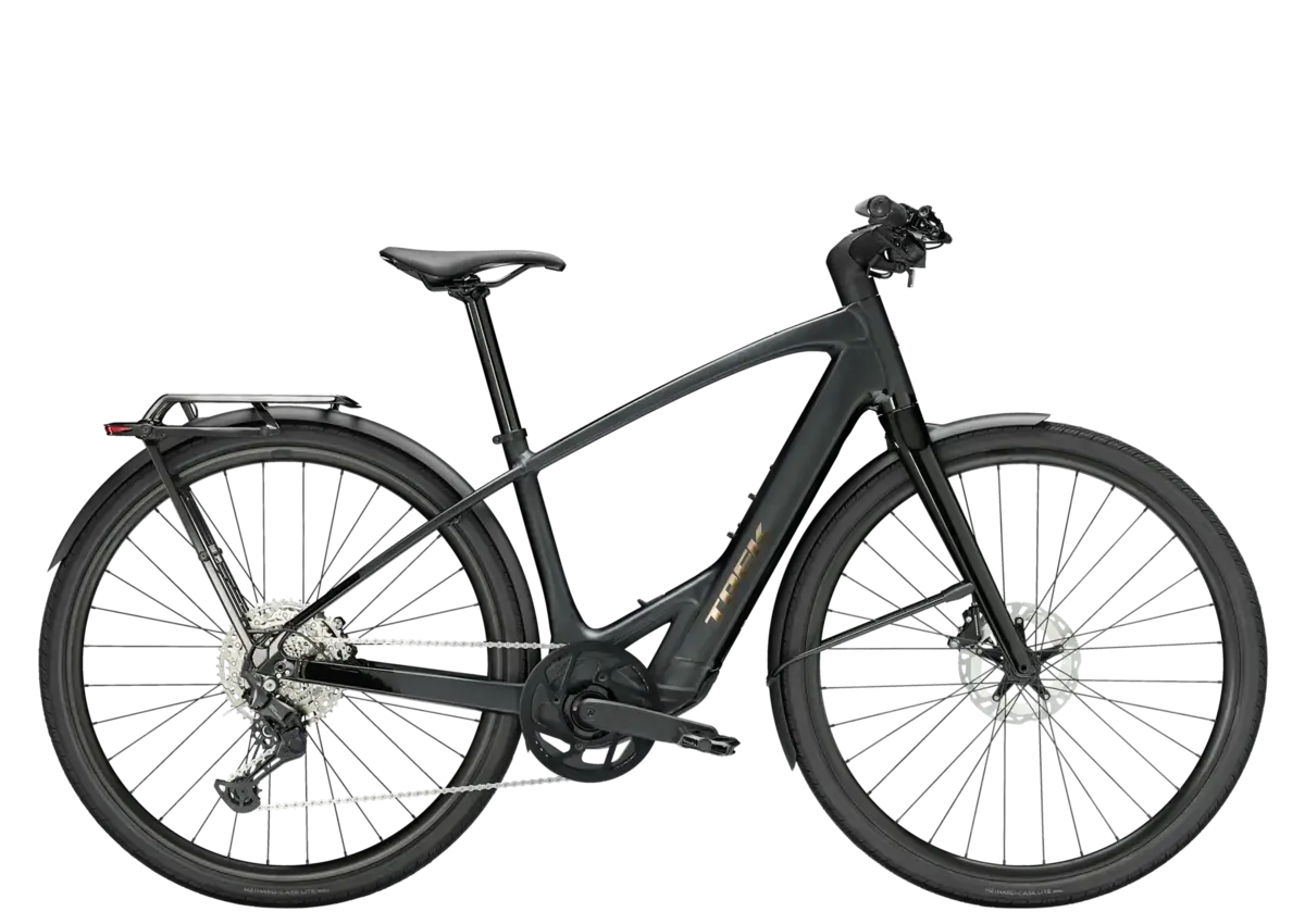 A sleek Alpha Platinum Aluminum frame with a carbon fork. TQ's quiet and compact HPR50 motor (50nm/250W) capable of speeds up to 28mph, with a 360Wh battery and built-in LED display. Clean shifts from a 10-speed Shimano CUES U6000 drivetrain, powerful hydraulic disc brakes, and 700c wheels with grippy 40mm tires. Plus, all the odds and ends you need for the commute, like built-in front and rear lights, a kickstand and a MIK-compatible rear rack.
